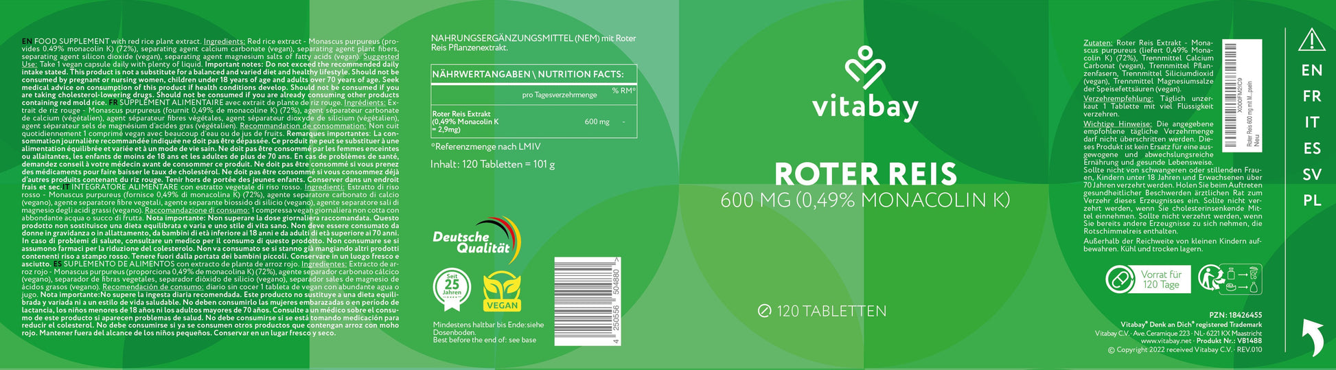 Roter Reis 600 mg mit Monacolin K - 120 vegane Tabletten