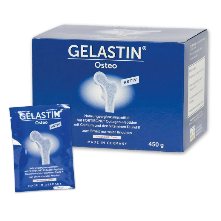 GELASTIN® Osteo contains 9 g of FORTIBONE® collagen peptides. This high-quality branded collagen has optimum bioavailability and can be absorbed and utilised very well by the body. It is enriched with calcium and the vitamins K2 and D3, which are vital for bones.