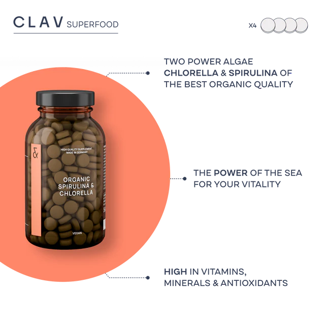 Algae are the superheroes of the sea and are particularly rich in important micronutrients. They also have a detoxifying effect on their environment, which makes them a very popular superfood today. In a world where we inevitably ingest pollutants through food or our environment, this talent makes microalgae a true must-have supplement. They are usually available to buy as chlorella tablets or spirulina tablets. Yet the sheer volume of available products can be quite overwhelming. At CLAV, we analyzed the abundance of spirulina and chlorella tablets and knew exactly what we wanted to do better. Our unique synergistic formula combines the concentrated power of organic chlorella and organic spirulina from gentle cultivation in one tablet - a natural and holistic support for your body.