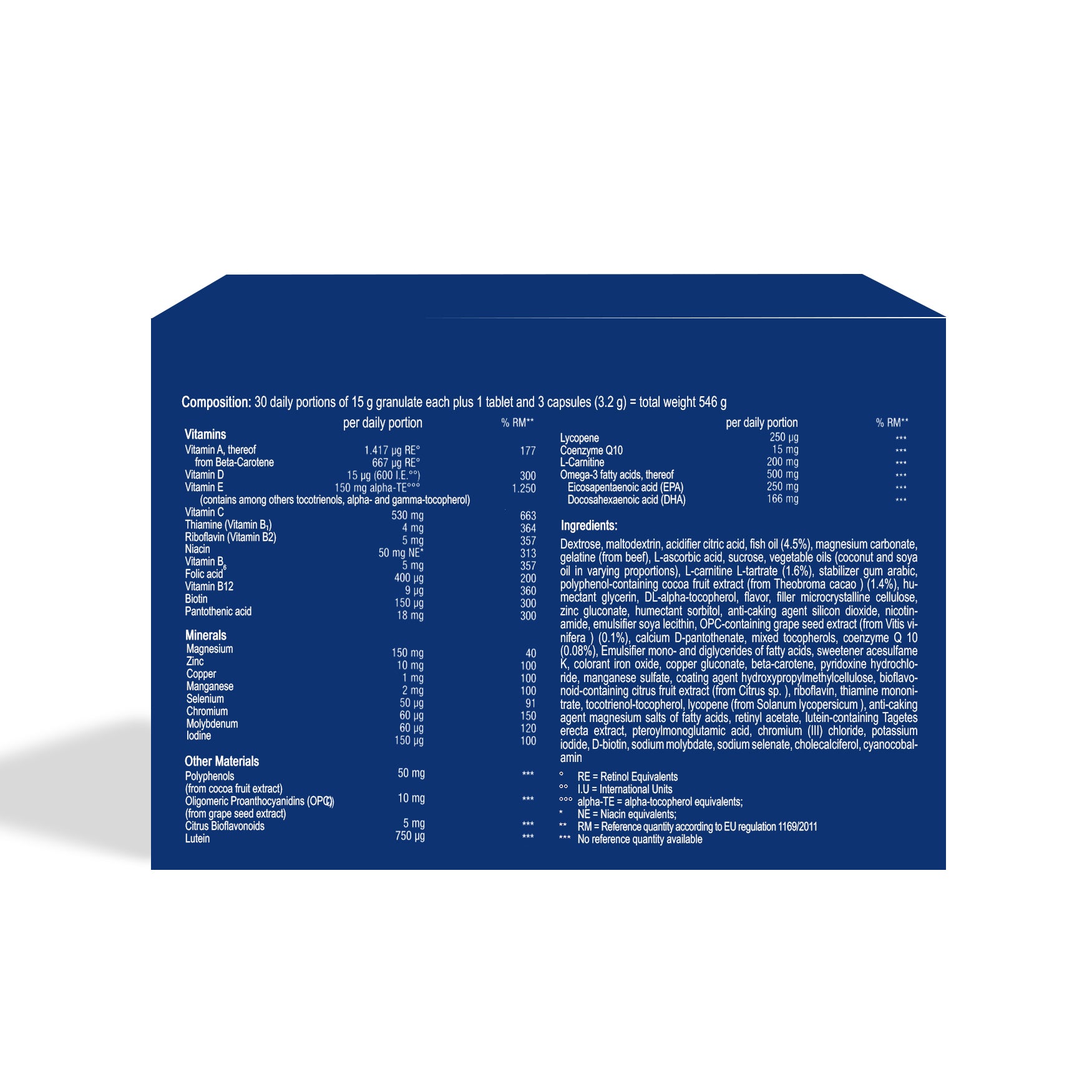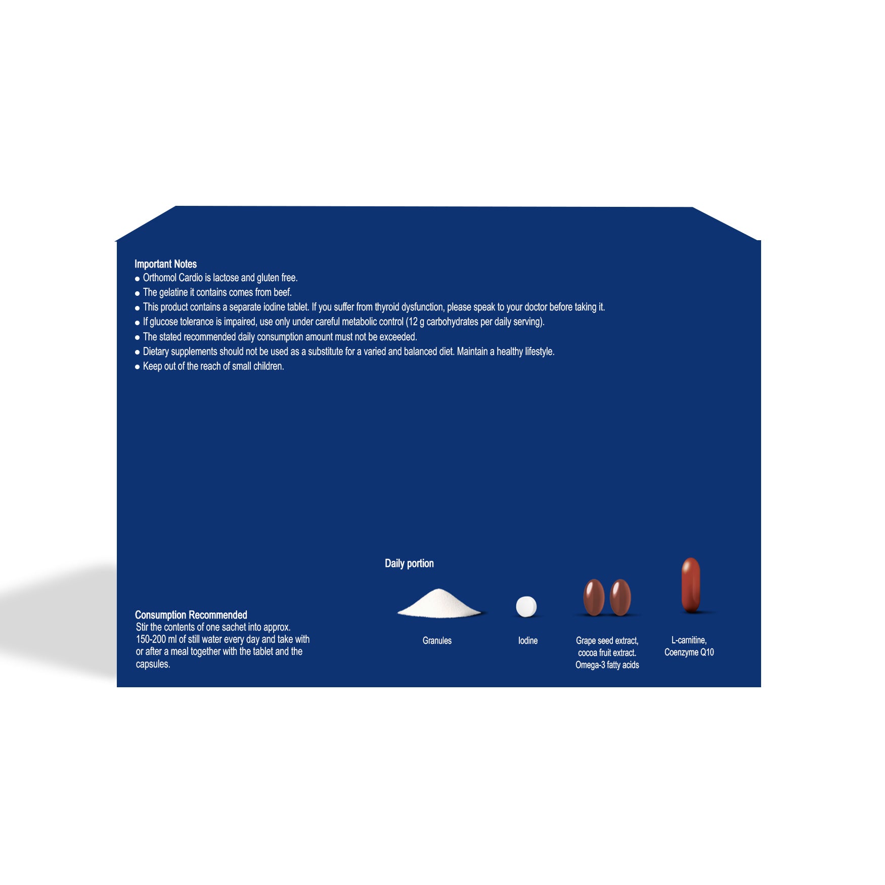 Stir the contents of one sachet into approx. 150 - 200 ml of still water every day and take with or after a meal together with the tablet and capsules.