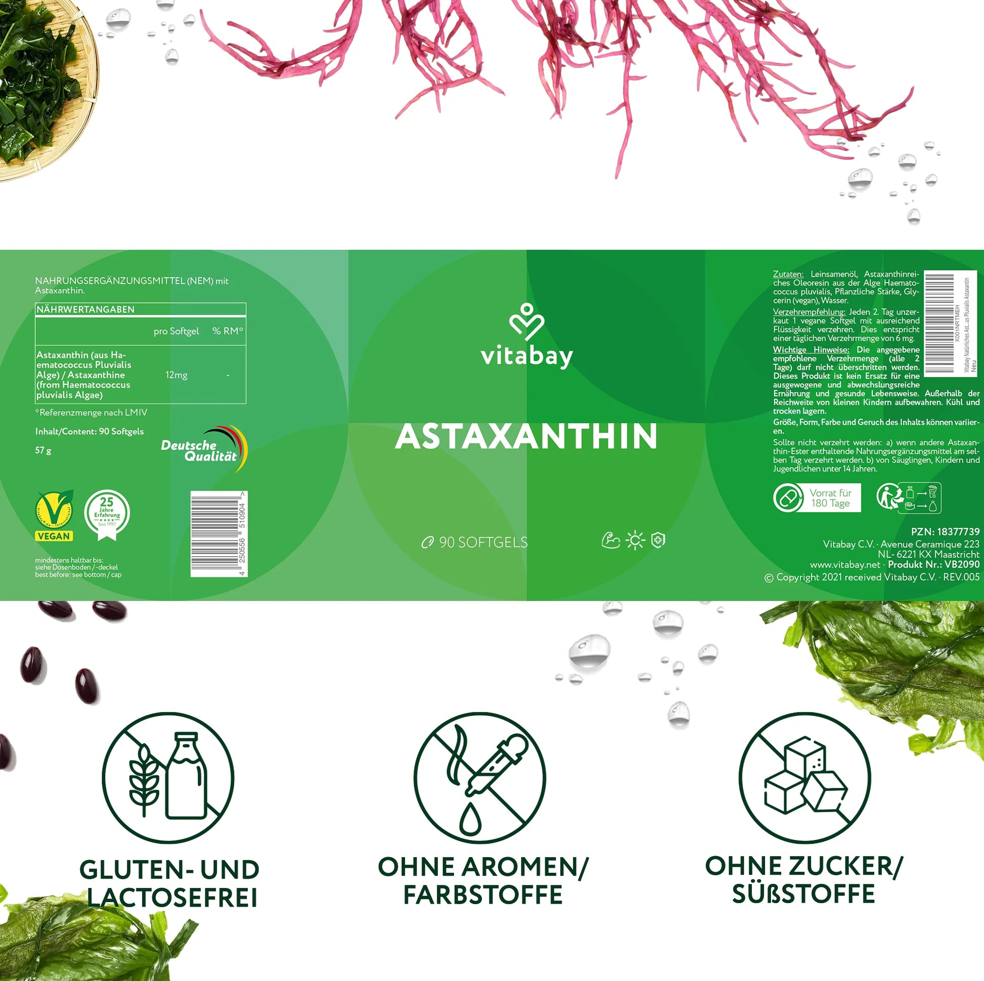 Pure astaxanthin: Naturally extracted from microalgae. Part of our vegan, additive-free line. Perfect for health-conscious people who value naturalness. Ideal addition to your daily diet.