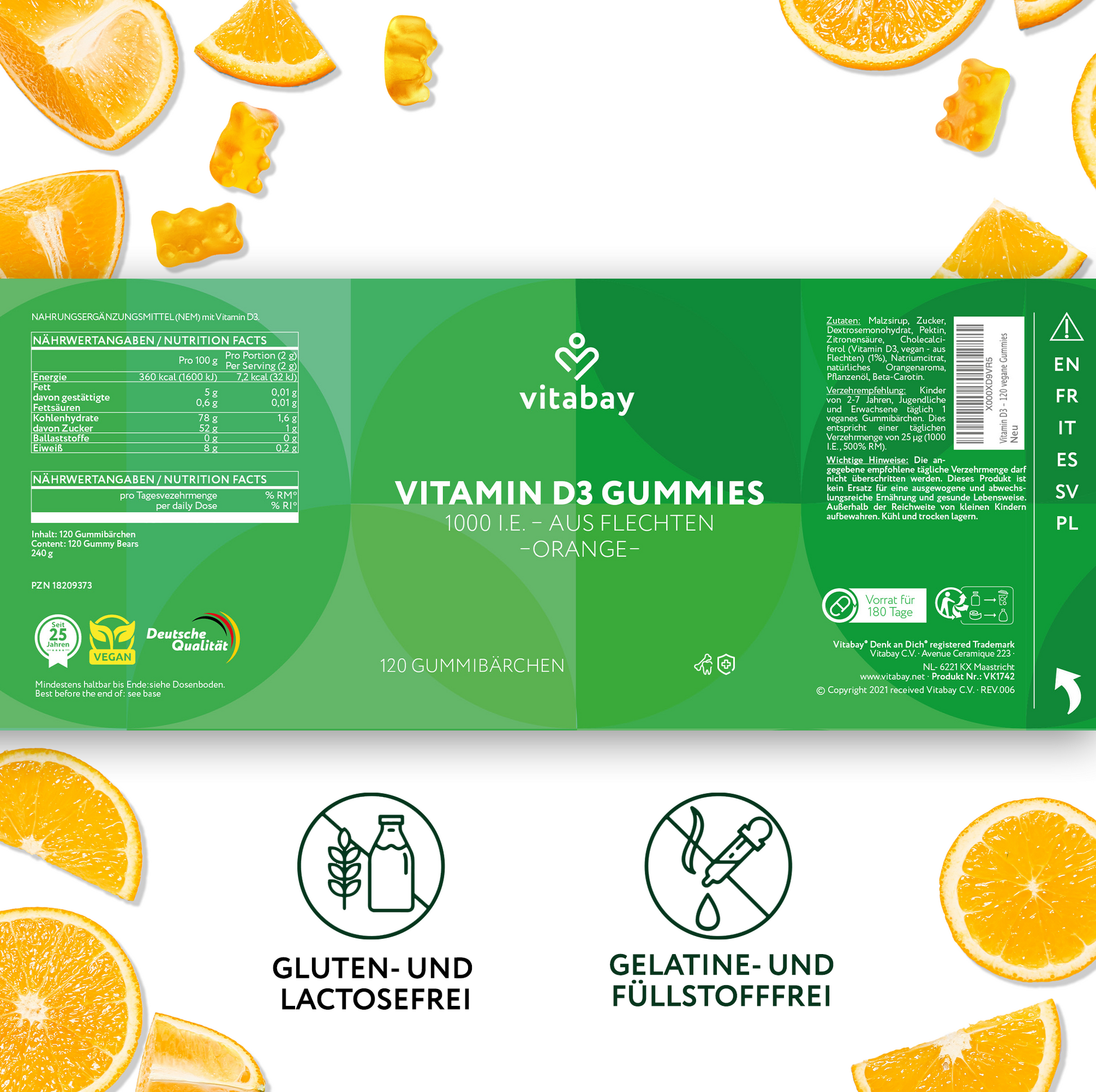 Discover our new Vitamin D3 gummies. Ideal for children as well as teenagers and adults. Our delicious gummies with orange flavor are purely vegan and derived from lichen. They support the normal function of the immune system and contribute to maintaining normal bones. Perfect for winter and on-the-go - a delicious way to supplement vitamin D supply. These practical gummy bears are a treat for the whole family and an easy way to ensure daily vitamin D intake.